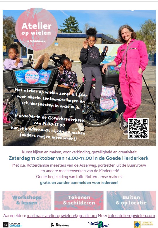 ![]() Op zaterdag 11 oktober is de feestelijke opening van de expositie ‘Schiebroekse kinderkunst,' samengesteld door Sonja van Dolron (Atelier op Wielen). Gelegenheid om veel moois te komen bekijken, maar ook om zelf aan de slag te gaan. Met een hapje en een drankje. 11 Oktober van 14:00 tot 17:00 uur, gratis en zonder aanmelden voor iedereen: mis het niet! | ||