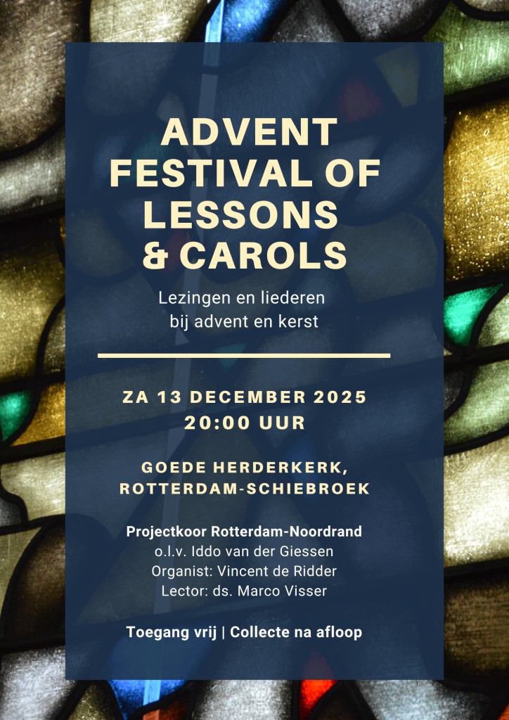 ![]() Het Projectkoor Rotterdam-Noordrand onder leiding van Iddo van der Giessen verzorgt weer een Festival of Lessons and Carols in de Goede Herderkerk. Zangers, musici en kerken in Rotterdam-Noord werken samen in een gezongen en gesproken kerstverhaal. Vincent de Ridder verzorgt de orgelbegeleiding van de fraaie en bekende kerstcarols en Marco Visser lezingen uit de Bijbel. Dit jaar staat er ook een carol van de hand van Iddo met een nieuwe tekst van Sytze de Vries gepland. De uitvoering begint om 20:00 uur en is vrij toegankelijk. Welkom! |